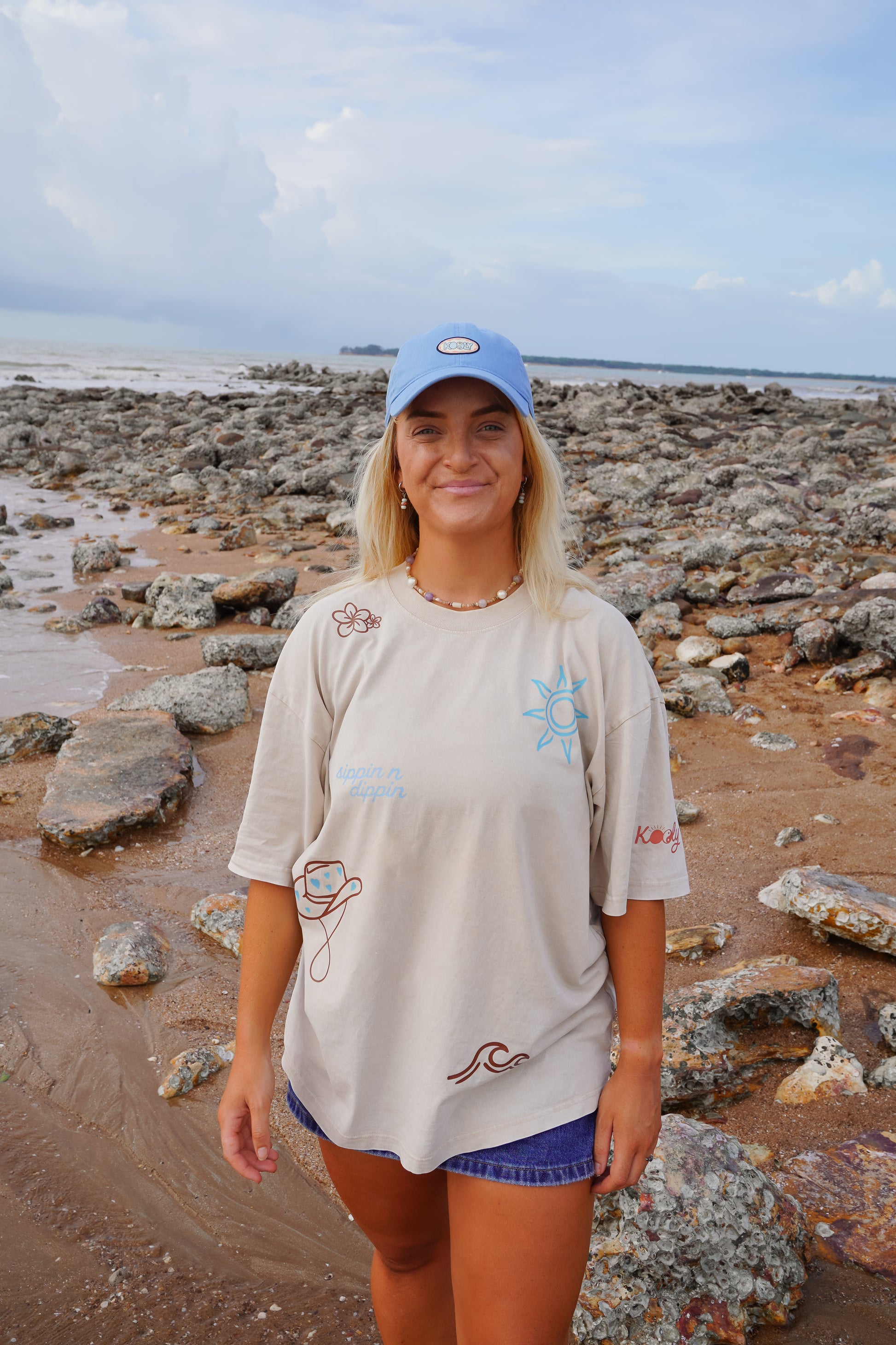 Inspired by tropics, sunshine, cold dips and good times, this tee blends warm brown and cool blue tones on the perfect lightweight bone base.